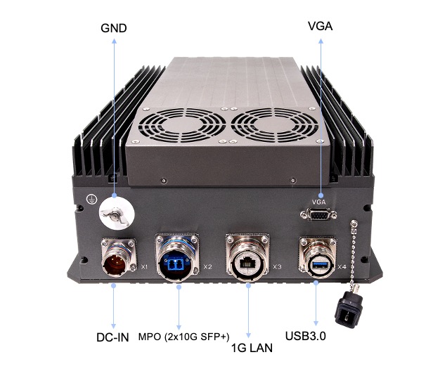 Military MXM-GPU System GPGPU AI Inference Computer with Intel® Xeon D-2183IT Processor, NVIDIA A2000, DDR4-3200 MHz 128GB RDIMM ECC, 2x2TB MLC support hardware erase for Fast & Mass Storage, IP65 rating, MIL-STD-D38999 Connectors, 18~36V DC-IN, Extreme Rugged operating temperature -20~+60°C